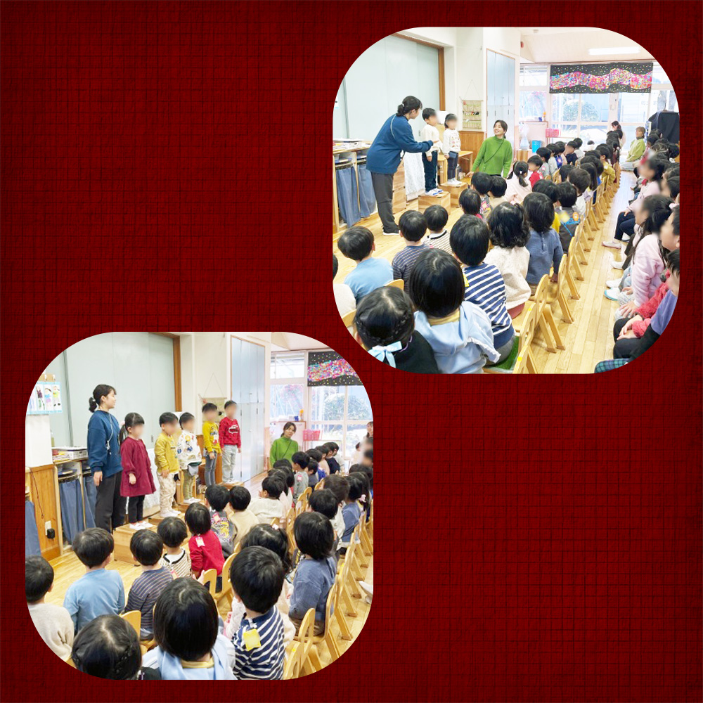 もうすぐ卒園する年長組のお友だちに、年少組と年中組のみんなが歌や記念品のプレゼントを贈りました。お昼は園庭でみんなで食べました。その後はゲームをしたり、「ソイヤ!」を踊ったりして、楽しい一日でした。