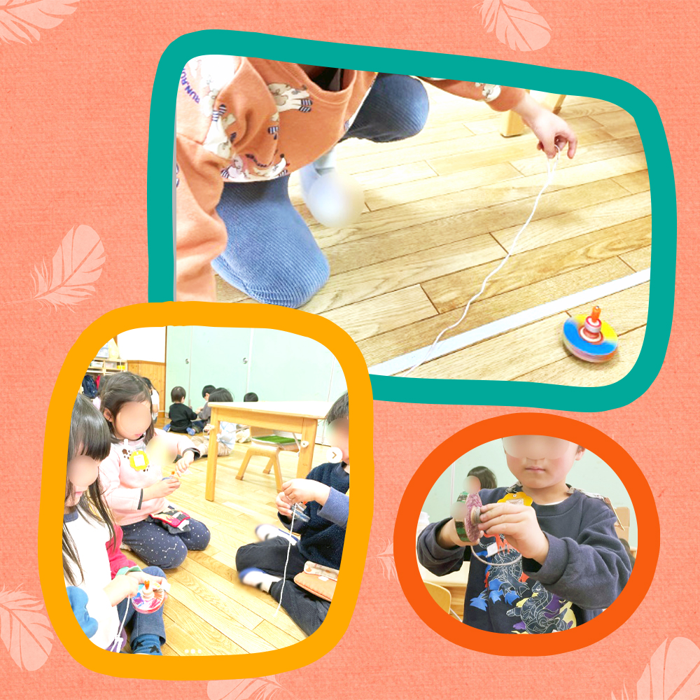 コマにクレヨンで色を付けて、コマ回しに挑戦しています!